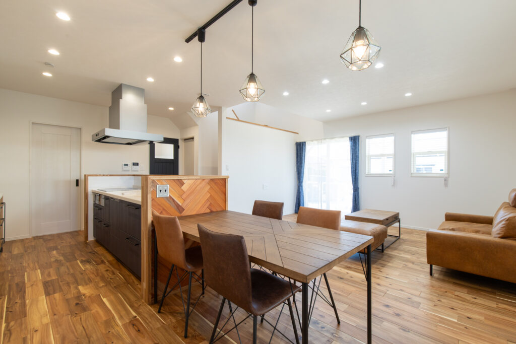 リビングはキッチン腰壁の造作ヘリンボーンと背面のモザイクタイル、ホワイトのルーバー扉、ターコイズブルーのドアがアクセントとなりお洒落な空間を演出しております✨
