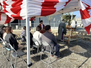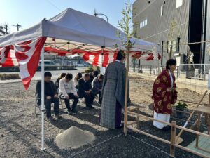 この度、皆様に新たなる住まいのご提案をお届けするべく、新しいモデルハウスの建設が本格的にスタートいたしました。先日、抜けるような青空のもと、工事の無事と安全を祈願し、地鎮祭を執り行いました。